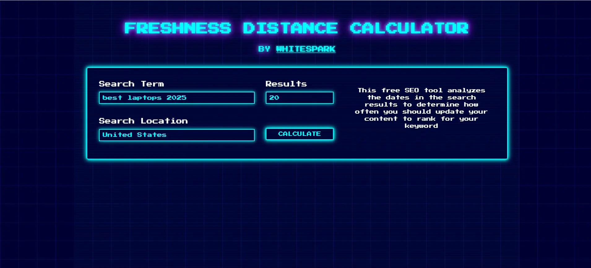 Pri ugotavljanju, kako ažurni z vsebino vaše spletne strani glede na konkurenco lahko uporabite zelo uporaben brezplačen kalkulator svežosti vsebine, ki ga je ustvarilo podjetje Whitespark: https://freshnessdistancecalculator.com/.
